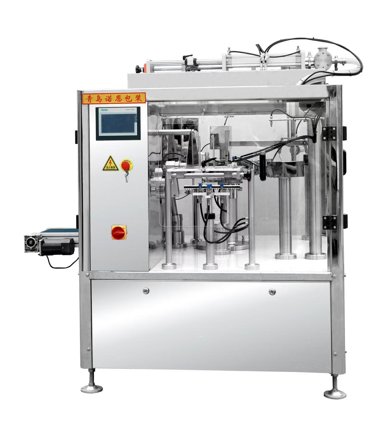 2.包装效率高,人工成本省到底全程自动化程度高,预制袋自动上袋、开袋、计量灌装、封口、出料一体化完成,无需人工手持袋子辅助,单台设备能替代 3-5 名人工。灌装精度可控(误差 ±1% 以内),不会出现人工灌装的溢料、少装问题,既减少物料浪费,又提升单位时间产量,批量生产时性价比极高。